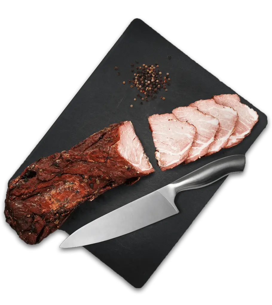 Produse țărănești cu specific local, realizate prin metode clasice de producție (sărare uscată/umedă) cu afumare în celule tradiționale cu lemne și rumeguș de fag, fără injectare și adăugare de aditivi alimentari.