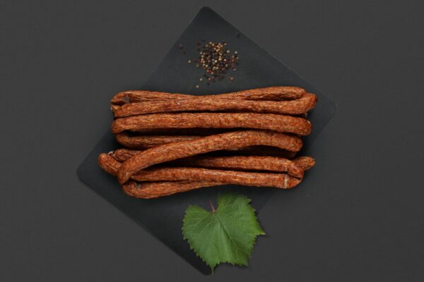 Cârnăciori din carne de vită și porc într-o proporție echilibrată specifică cârnăciorilor de casă, fierți și afumați în membrană naturală.