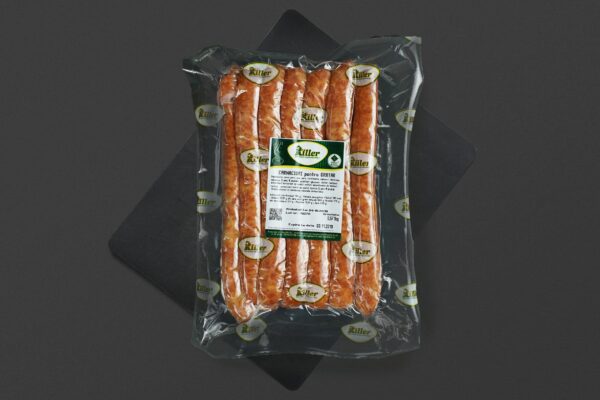 Cârnăciori din carne de porc, afumat în membrană naturală comestibilă.
