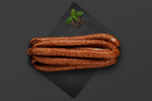 Cârnăciori din carne de vită și porc într-o proporție echilibrată specifică cârnaților de casă, fierți și afumați în membrană naturală.