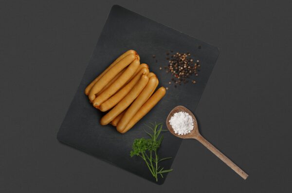 Crenvurști din piept de pui fierți și afumați în membrană comestibilă.