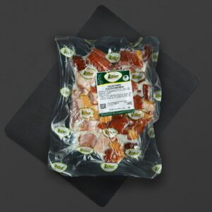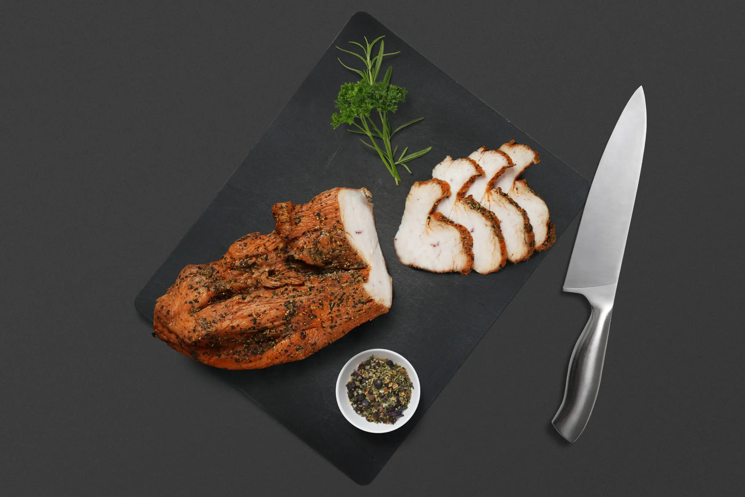 Piept de curcan maturat în sos condimentat, fiert și afumat.