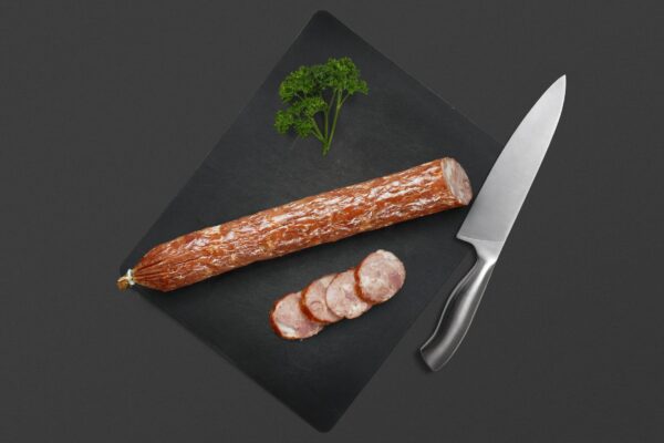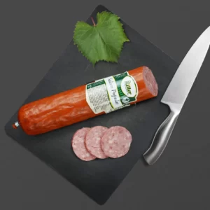 Salam cu bucăți mari de pulpă, fiert și afumat în membrană necomestibilă.