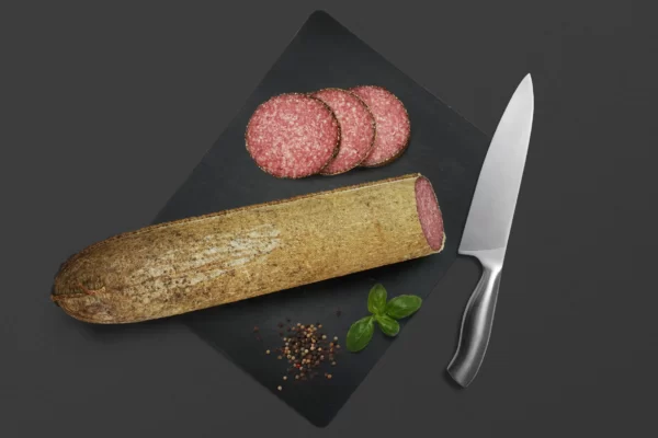 Salam demisec din pulpă de vită și slănină, învelit cu piper măcinat, etuvat și afumat.