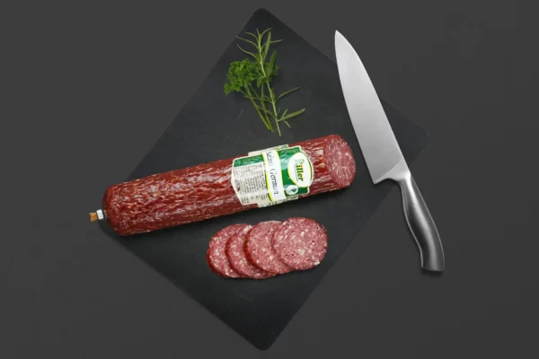 Salam demisec din pulpă de vită min. 70 % și slănină, etuvat și afumat în membrană necomestibilă.