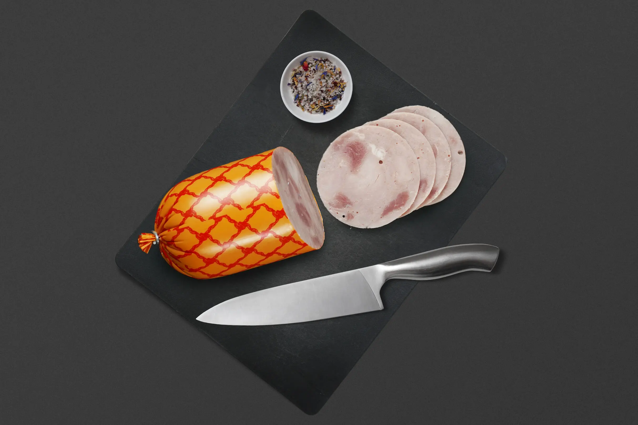 Șuncă din pulpă de porc, fiartă în membrană necomestibilă.