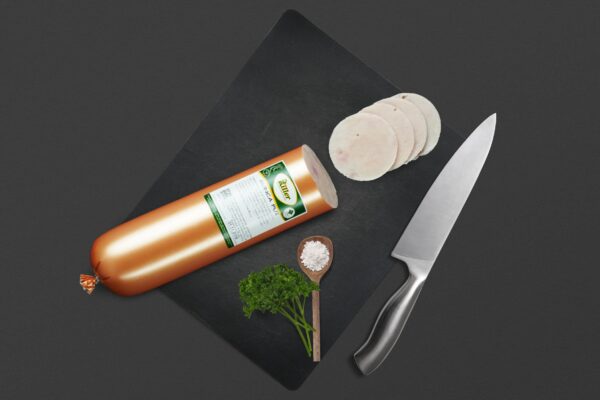 Șuncă din piept de pui, fiartă în membrană necomestibilă.