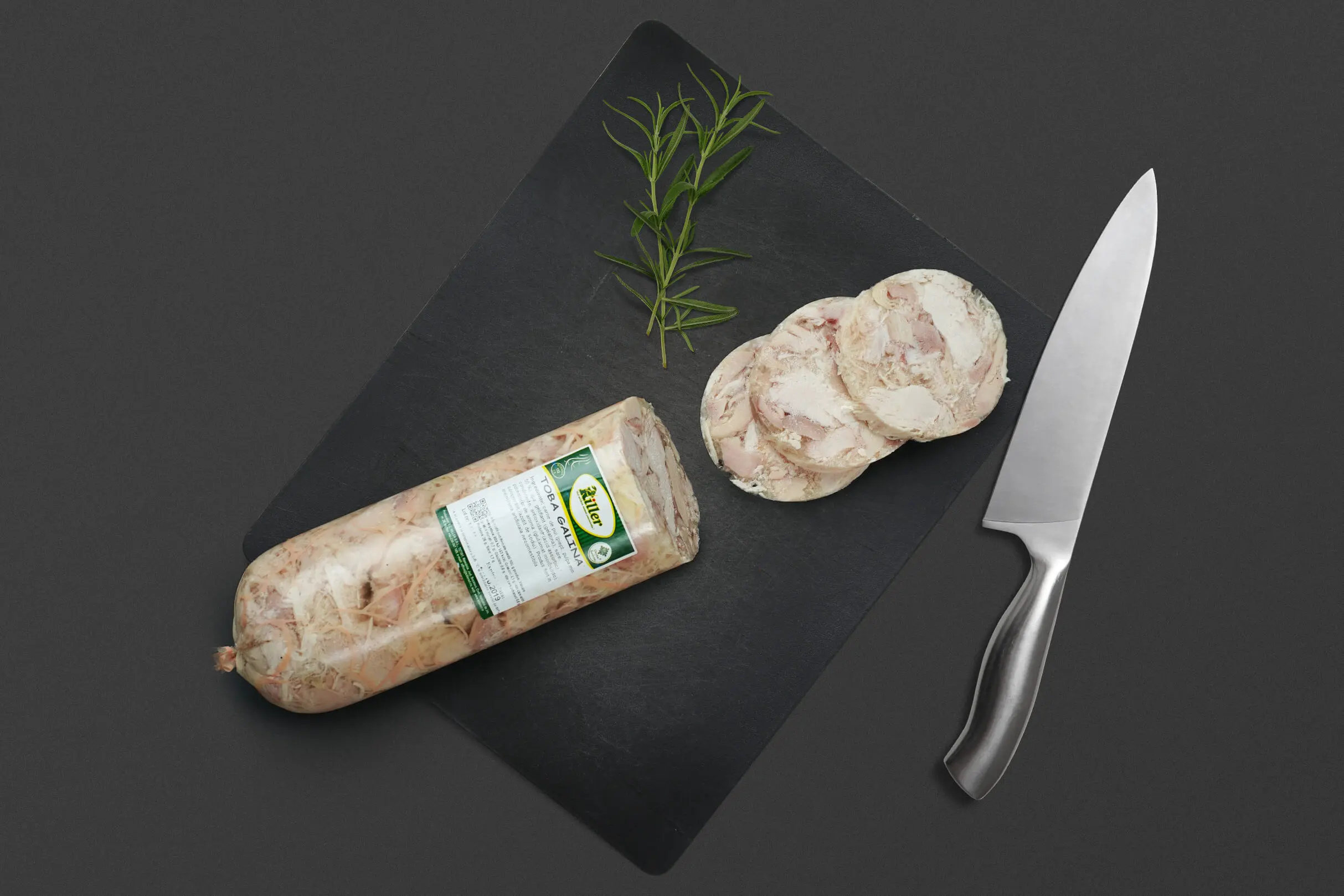 Produs din carne de pui, fiert în membrană necomestibilă.